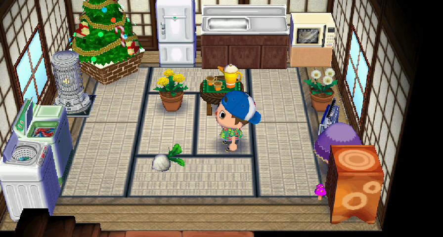 現時点の部屋の様子です(^^ 派手目の部屋はGC版やDS版でもいろいろ作ったので、まずは地味目の生活感のある部屋を狙っています。 半分以上はどうぶつさんからのもらいものかなー。 2つの洗濯機はどちらももらいものです(^^; 和風っぽくなったので、真ん中はちゃぶだいだなーと思って注文しました。もう少し大きいものをかと思ってましたが1人ちゃぶ台ですね(^^; いたまつきたたみを見ると、昔のおばあちゃんの家を思い出しますねー。おばあちゃんちはそのころ掘りごたつでしたが、どう森では掘りごたつはないはずだなー(^^; いろりは本格和室を作ったときに注文しようかと思ってます(^^ 少し前ですが、あやしいランプを見つけました。昔の版でもあったっけ? とりあえずつっついてみましたが何も起きませんでした(^^;