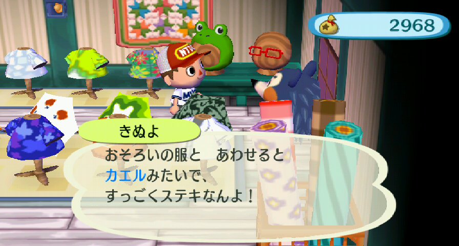 PROデザインが今回から入って、以前より細かいデザインができるようになったのはいいのですが、デザイン機能をWiiのポインティングだけでやらせようというのは、ビット職人泣かせだなーと思ったりします(^^; まー逆にあまり作り手のスキルに依存させないというのは、幼い子供も作るのだから考え方としてはあると思います。ただデザイン機能はDSと連動させて手元でビット絵を描けるようにすべきだったなーと思います(というかWii版では当然のごとくDS連動でマイデザインがあるとばかり思っていたのですが(^^;) それでも怪しい服や帽子は結構増えています。 この前、セーラー服が売ってました。きぬよちゃんは「合わせると水兵さんみたいでいいんよ」って言ってましたが、どう考えても下はスカートに見えるのですが(^^; ・・・今度、女の子キャラの倉庫でも作ってから着せますね(^^;