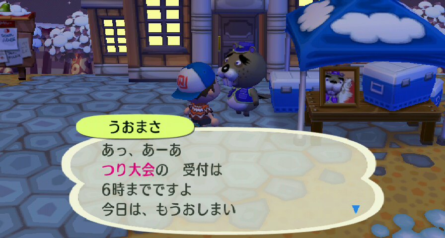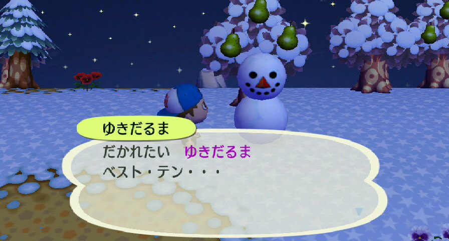 朝は買出し、昼は一杯飲みながら寝てたら、魚釣り大会を始めそこねていました(^^; 時計変えずにおいてたらよかったかなー。 というわけでめげずに久しぶりに雪だるまを作ってみました。今回は雪球や埋まってる穴はなんとなく見つけにくい気がしますが、運良く1回でできました(^^ 雪だるまに抱かれたら冷たいんですが(^^; とたけけライブは今日は定番の けけのロケンロール を頼みました。どう森の曲というとやっぱりこれが思い浮かんでしまいます(^^ あと空にオーロラっぽいものが出てました。今回からの新規ですかねー なかなかきれい(^^