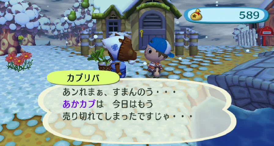 先週末も結局カブは110ベルくらいまでしか上がらず、週末には51ベルだったかな(^^; 大赤で売却でした(^^; で、今回も10カブだけ購入して、部屋に置こうとしたら、間違えて口元に持って行ってしまいまして。 カブ食べちゃいました(^^; いやうまそうに食べてくれるのはいいのですが(^^; カブの上がり下がりを楽しむネタがなくなってしまったなーと。。。どうもコンテキストメニューがいまいち混乱しやすいような。。。 赤カブは売ってくれないんですよねー。おそらく平日と時間ずらしするのでなんかチェックが来てるんでしょうねー。それとも日曜は早起きすれば買えるのか?(^^ 土日遊んでて、やっぱり時間がきちんと同期してたほうがどうぶつの森の味は出ると思うのです。思うのですが店が使えないというのはどうもなー(^^; そうそう、御利益があるそうで捕まえました(^^ 次は何に御利益がつくんでしょうかねー。