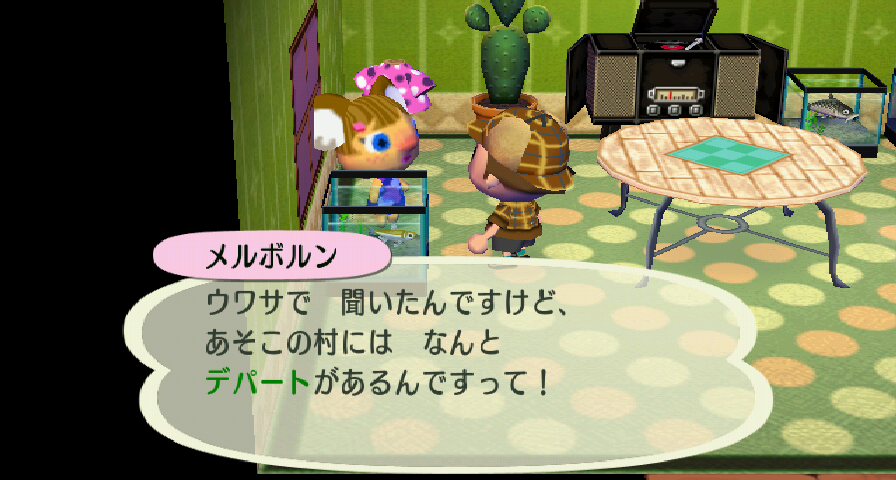 今日メルボルンちゃんと話してみると 「キングさんとこの村でデパートが開いているといううわさを聞いた」のだとか。 ほー、キングさんとこには1回しか行ってないし、しかもそのときはまだスーパーだったはずなので・・・ おともだちで通信したことのある村の変化は、どうぶつさんに定期的に報告が入っているってことですねー。意外なところがこってるな(^^