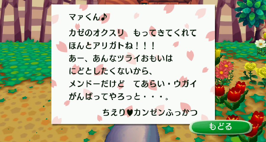 まぁあいかわらずじわじわくらいな感じですな。 母の日に届いたのは母からの手紙とピンクカーネーション(^^ というか母の日は、母に贈るものでは? と思ったりしますがまぁ気にしても仕方がない(^^; ピンクカーネーションって昔からあったんですかね。 ちえりちゃんからは、風邪薬のお礼にお手紙がきましたが、添付のプレゼントはボロいつちかべですか(^^; そうそう、ナギちゃんからはたまーにYahooメッセージが来ます。ありがとねー(^^ ですが、なかなかタイミングが合いませぬ(^^;