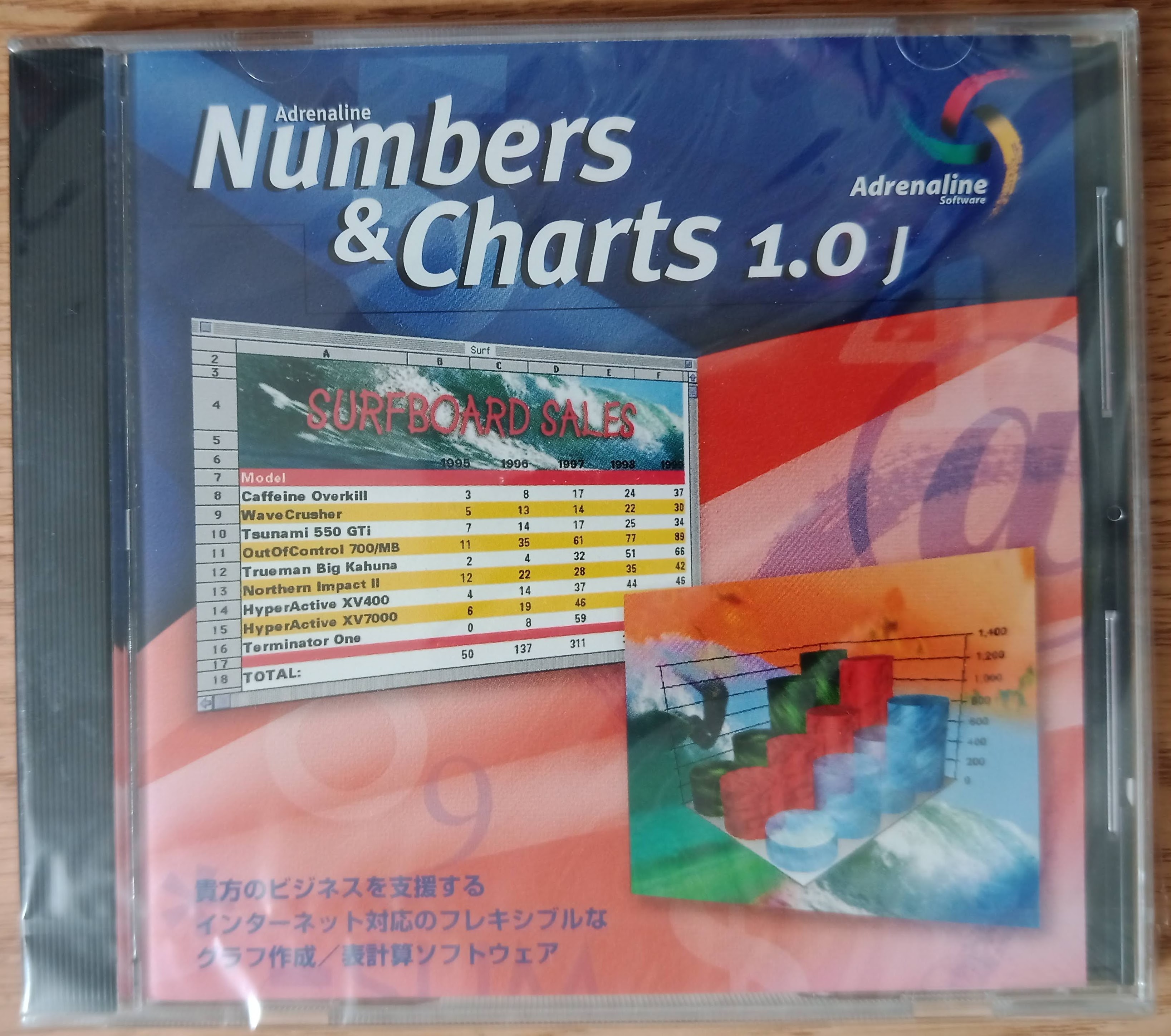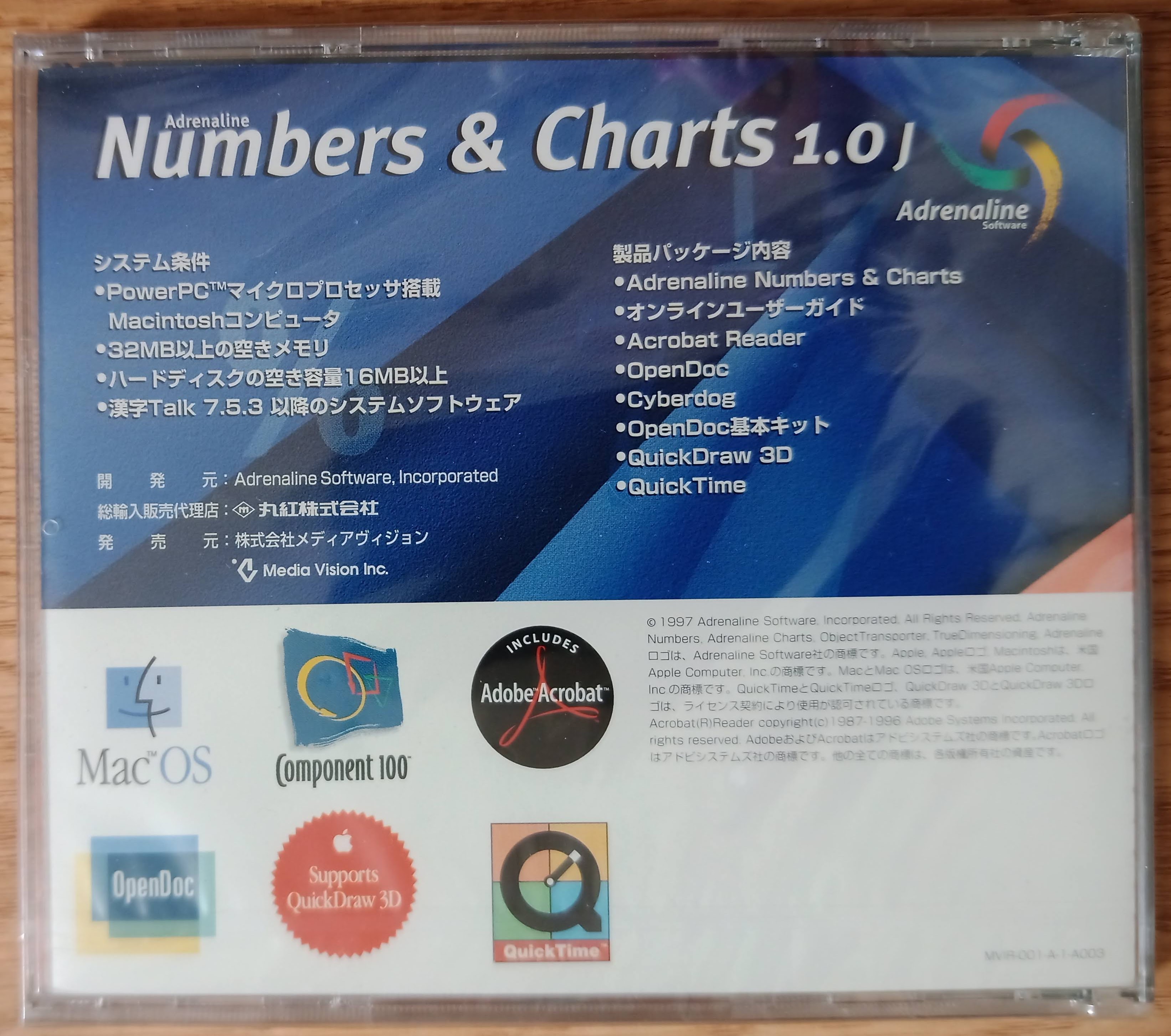 あまりにOSディスクなど地味なCDが並んでいるので、私の持っているCDの中では珍しいほうのCDを取り出して、Adrenaline Numbers & Charts 1.0jです。OpenDocベースでの表計算+チャートソフトです。この時期のOpenDocソフトではCyberdogと並んでもっとも凝った出来のソフトではあったが安定性は微妙だった記憶がある(OSの安定性も含めてOpenDocの安定性では仕方の無いところではあったが)
