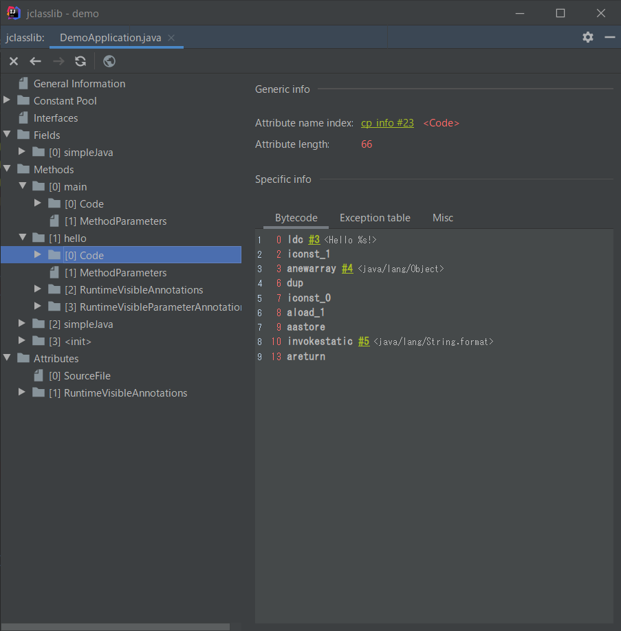- Method メソッド定義 Code部にバイトコードがアセンブラ風に表示される
