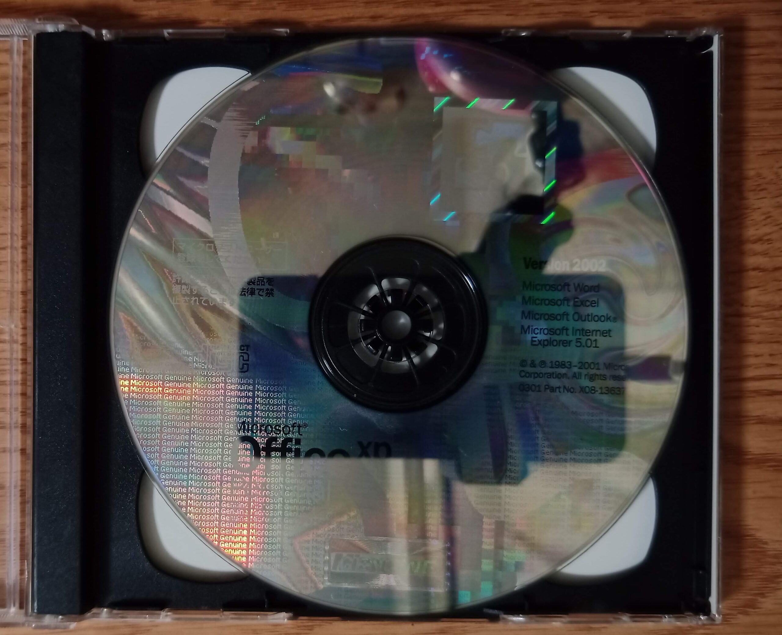 Microsoft Office xpの製品版CDだと思う。表面加工されすぎていてよく見えない。背後の黒いのは撮影用の古いスマホなのでデザインではない。