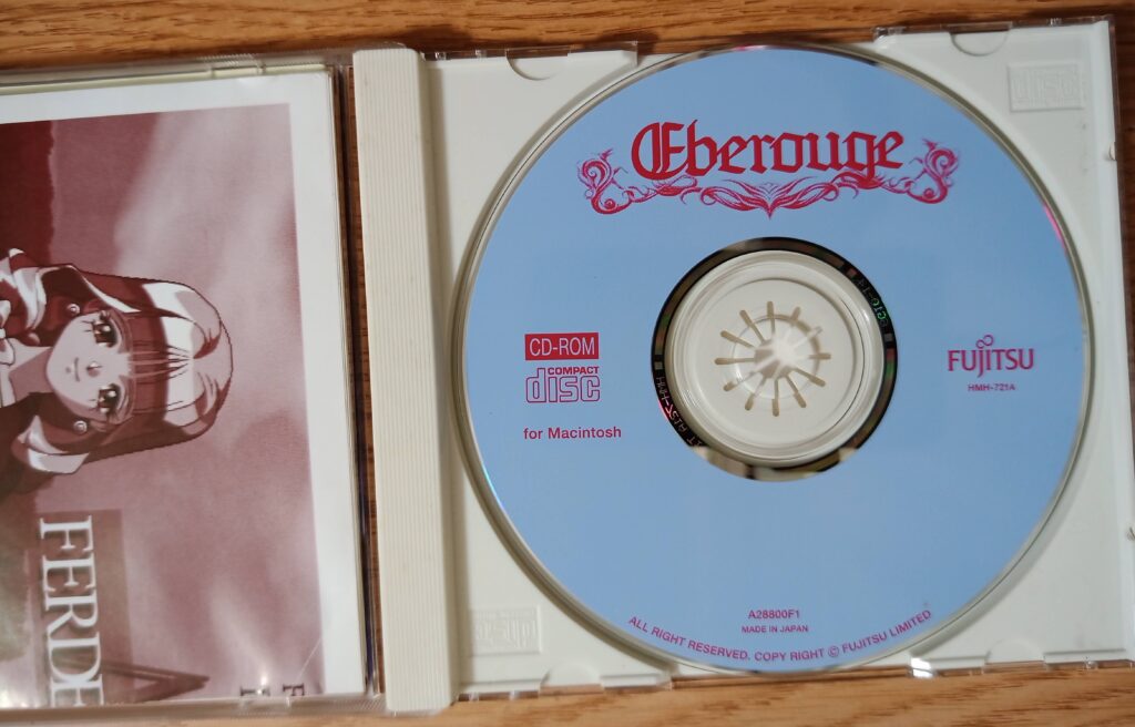 Eberouge 結構珍しいと思う旧MacでのゲームCD。アドベンチャーだったと思うが細かくは覚えていない。Macでのアニメ絵ゲーム(表紙だけだったかも?)というのも珍しいし、日本製というのも珍しいし、富士通が出しているというのも珍しい気がする。例のごとく少し立ち上げたくらいでほとんどやってないと思う。