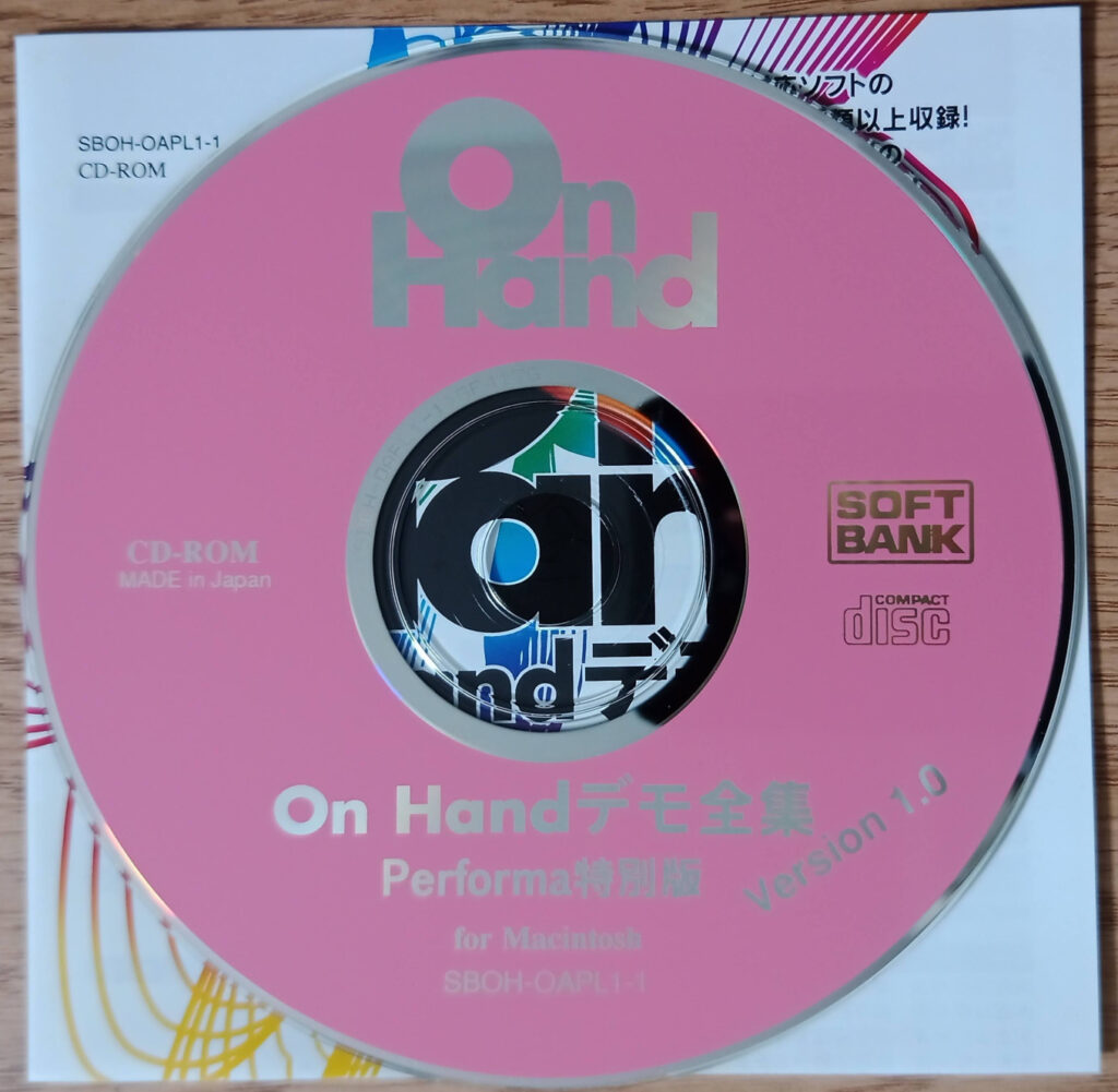 On Hand という製品ソフトの体験版を集めたCDだと思う。Performa特別版とあるからMac Performaを買ったときに添付なのだろうが、もしかしたら何かのビジネスショーでもらったのかもしれぬ。どちらにしても体験版を集めて仕切るだけでビジネスになっていた時代ということだろう。