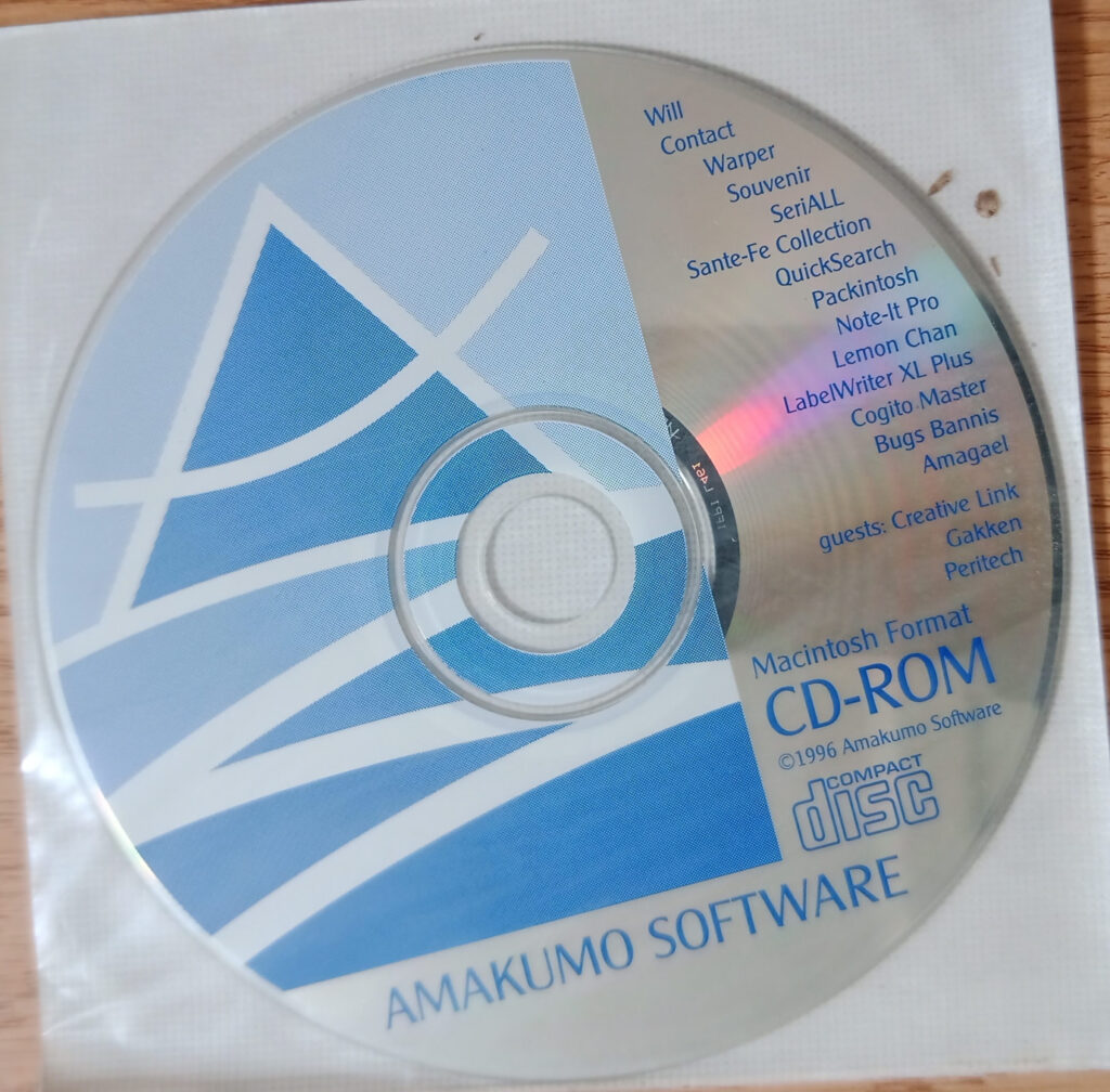 AMAKUMO SOFTWAREと書かれたCD これは何だったのか本当に記憶がないのだが、おそらく当時のなんらかのビジネスショー(晴海かメッセ)でビジネス向けに配られていたCDだと思う。見た感じMac関係の独立ソフトハウスの製品体験版サンプラーかな。