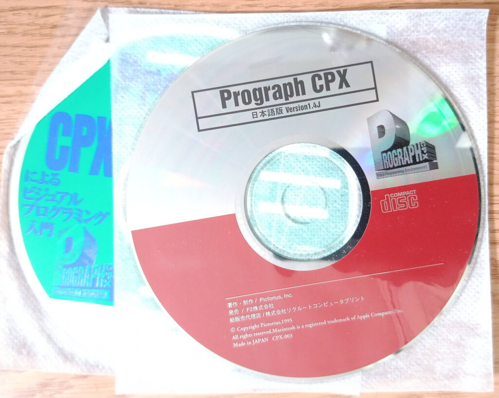 ビジュアルプログラミング環境として結構がんばってたPrograph CPXです。後ろのCDは当時の技術本の付録体験版かな。