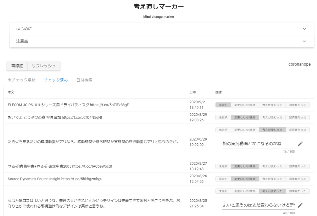 とりあえず試作してみた考え直しマーカー。しばらく使ってみたが、Twitter側がマーカー側アカウントをスパム扱いして自身からはリンクが見えなくなるのが問題。。。まぁイリーガルな使い方なので仕方が無いところかも。