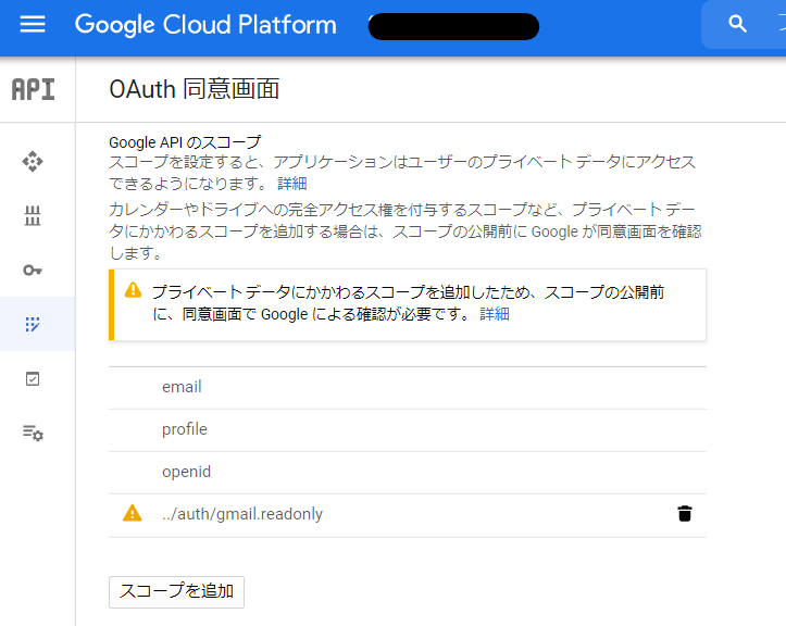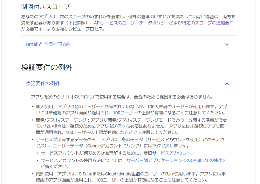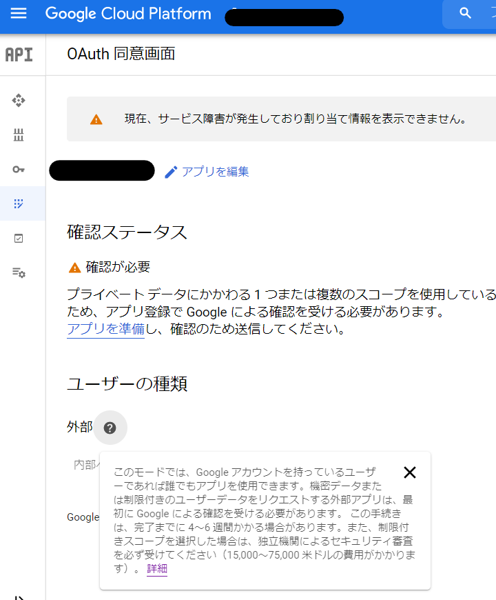 ただし認証操作時に警告画面が出るがこれを消すにはやはり面倒な審査とお金がいるらしいと解釈。でもなんとか読み込み権限までのoauthの認証ファイルは手に入るな。