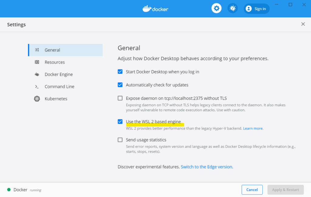 DockerをWindowsで使うときはローカル開発などパフォーマンスが気になるケースはほとんどないだろうから、WSL2 をオフにしておいたほうが悩まずに済む気がする。