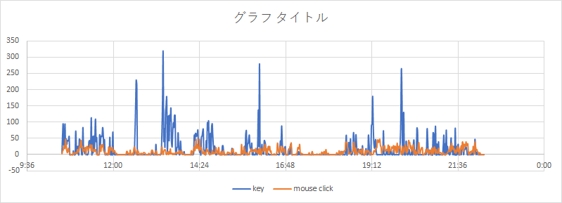 これはとある日の自身のキーボードタイプとマウスクリックの分布です(朝起動を忘れた時間があるので朝が少し途切れている) これは