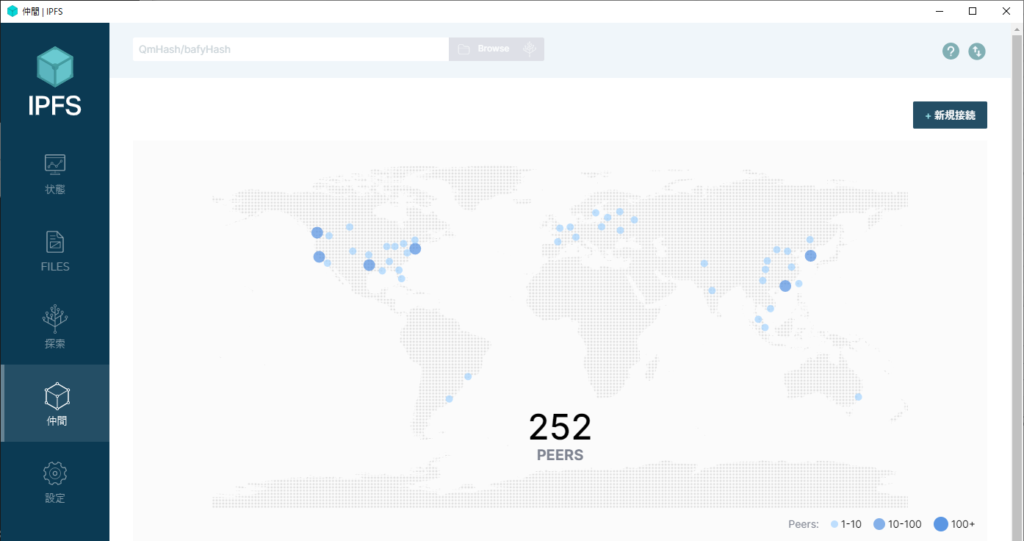 とある日のipfs desktopの画面。日本に近い大きめの●は日本ではなく韓国。