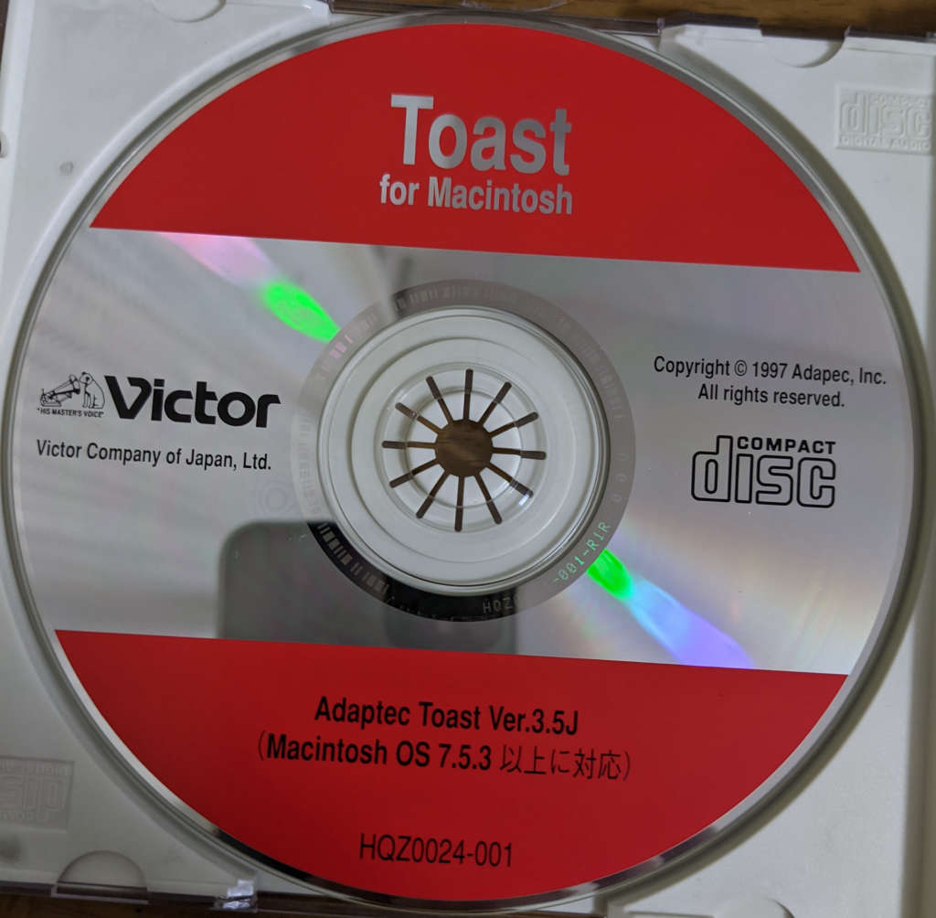 製品のマスタリングにも結構使ったCD-ROMライティングソフトのToast。 Adaptecに買い取られた後にVictorの外付けCD-ROM Writerにバンドルされたみたいな感じのCDかな。