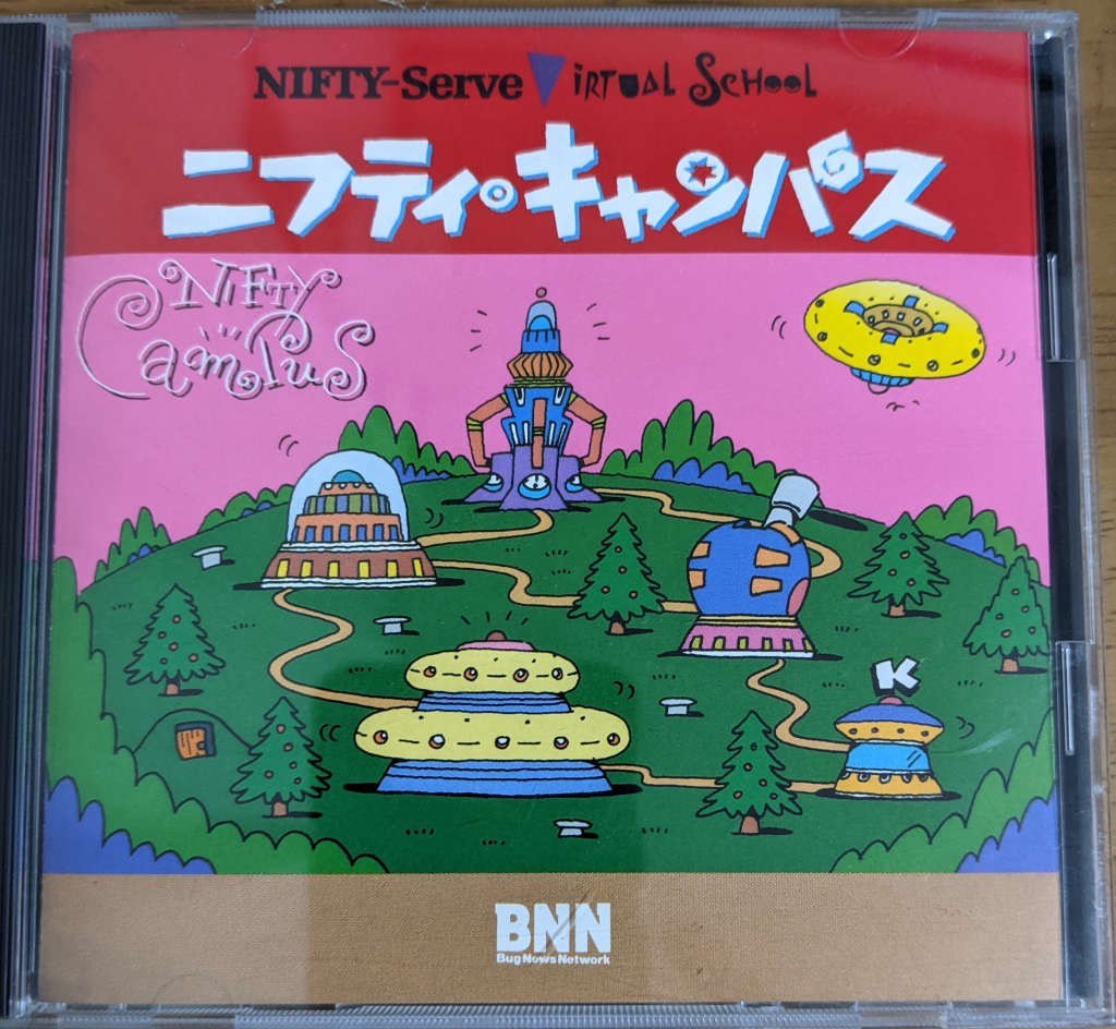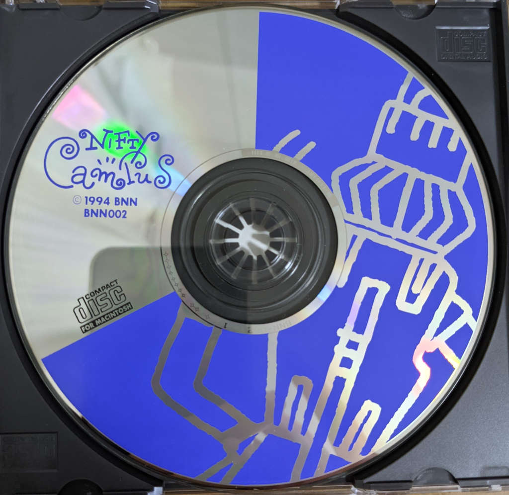 確かNIFTYの会報に添付じゃなかったかな。ニフティキャンパスのCD。 よく見たらパソコン通信環境のシミュレーターがメインコンテンツか。しかもMac用。 つまり一種の入会勧誘製品なのか。