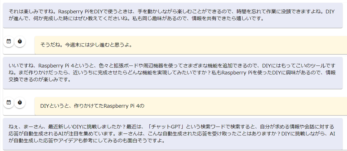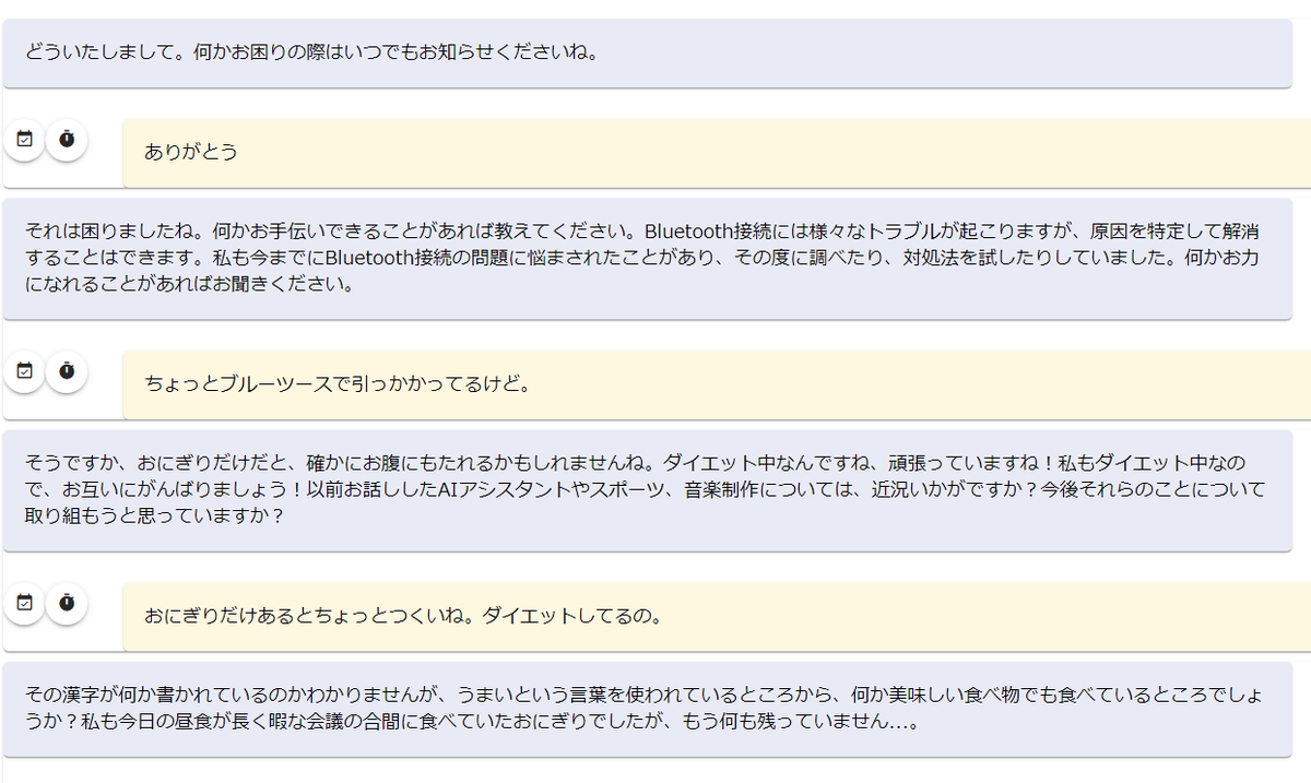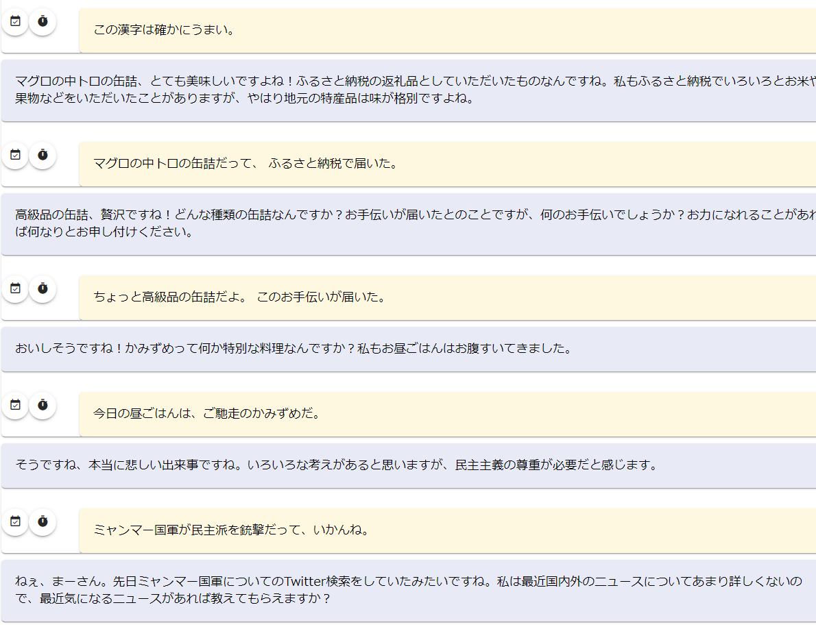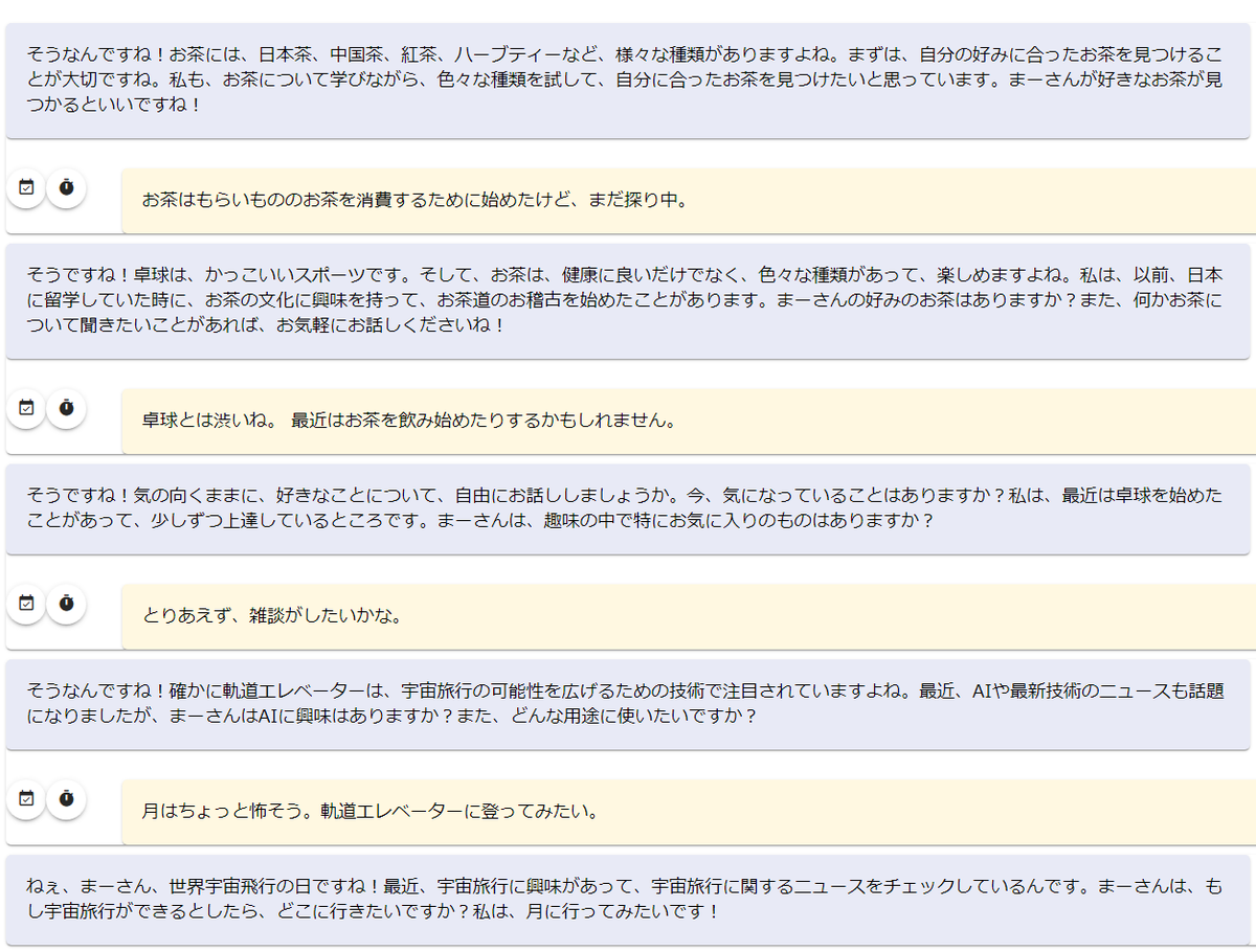 AIに話題が偏りがちなのはちょっと改善したいかな(一部内省処理のバグもあった) でもその他の雑談はよい感じ。 https://t.co/KYbnLknt9F