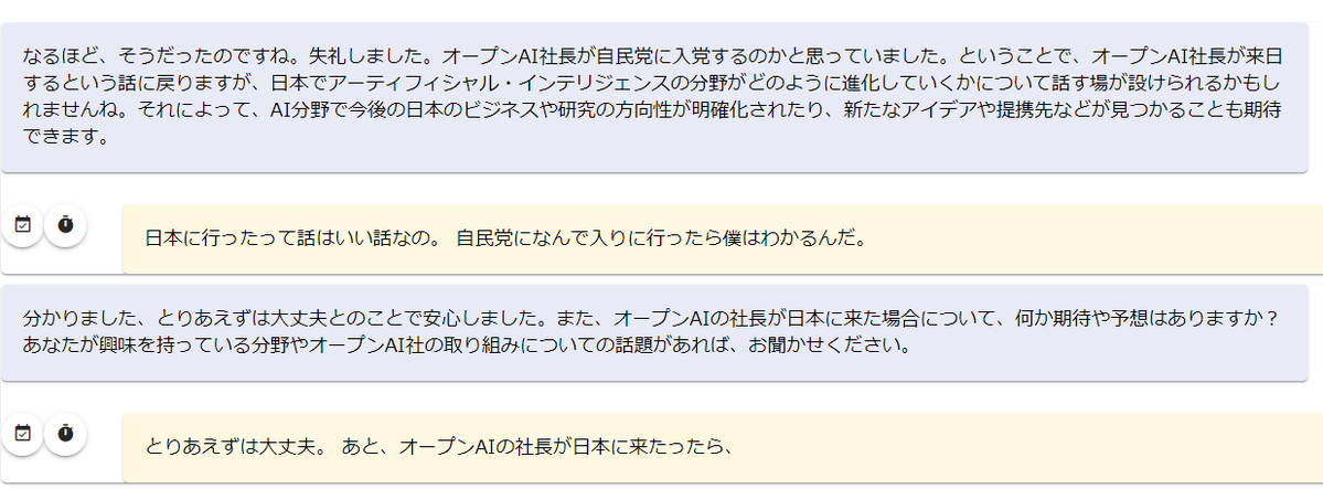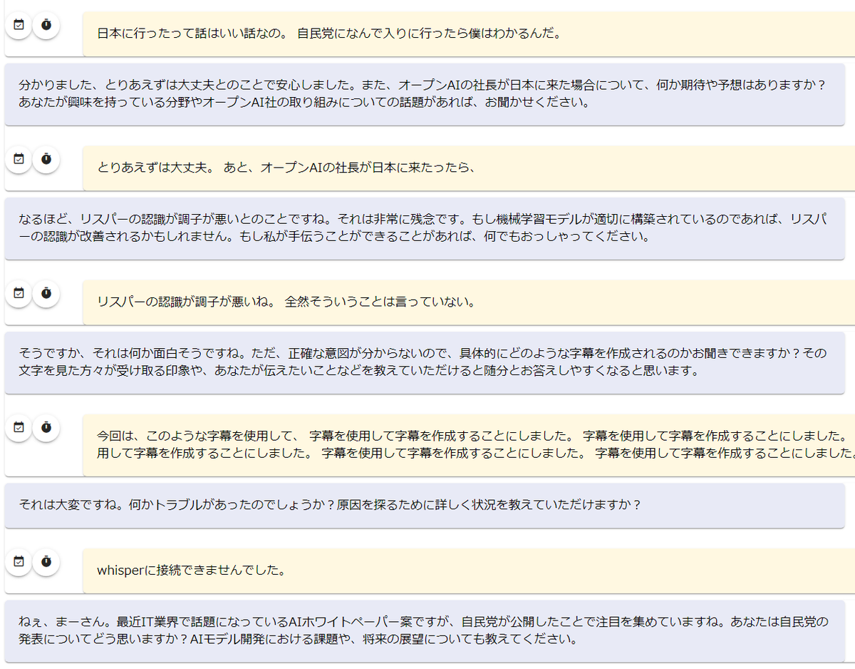 Whisperの認識エラーがちょっとひどい。が、ChatGPT側はよく受け答えしてる。「~という話に戻りますが」のところもうまく答えるな。しかし入党って。。 https://t.co/tdP8W5XZgh