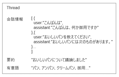 これらをRAG情報として扱うために、短い一定時間の間に行う短い会話の集まりを「スレッド」という単位で保存する仕組みとしています。