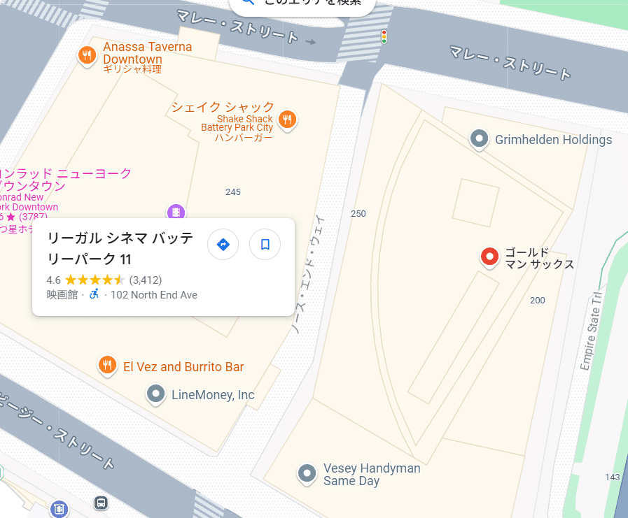 説明通りに「ゴールドマン・サックスのビルがそびえ立ち、通りを挟んで向かい側にはリーガル・シネマ・バッテリーパーク11」があるのは確かなようです。旅bot処理で地理情報として与えているものは「場所名と場所の属性(役所、店、学校、映画館みたいな粒度)」のリストで座標情報などは与えないので、「この2箇所が通りを挟んで向かい側」みたいな情報はo1自身が学習してたんでしょうね。