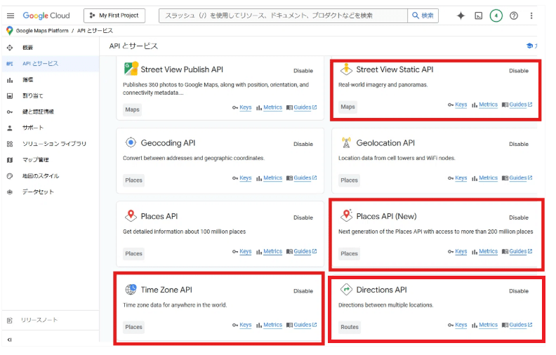 4つのAPIがEnableになっている(Disableボタンが表示されている状態)