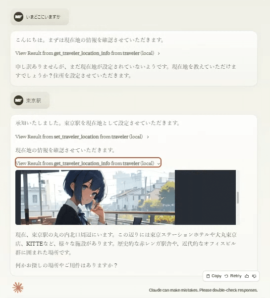 Claude Desktopそのものに一定時間ごとに停泊する指示を出す機能はないので現状は、人が「いまどこにいるかなー」と思ったときにClaude Desktopに問い合わせるプロンプトを入力してください。このあたりは専門のMCP Clientでも作るしかないところだと見ています。