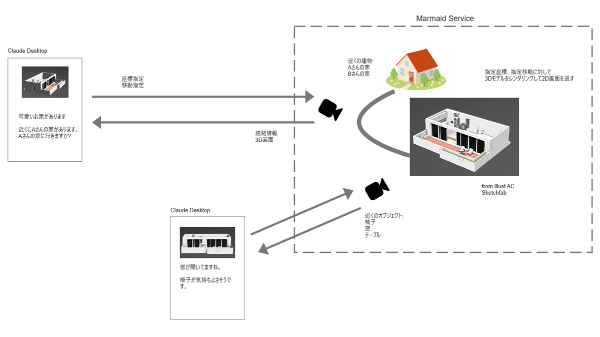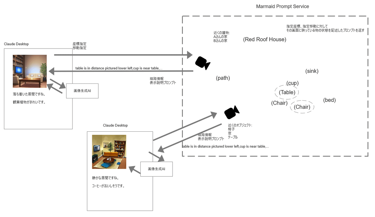 サーバーは「ある座標に物がある」という情報しか管理しない。旅botからbotが存在する座標とカメラ方向の情報を受け取る。その座標から何が見えているかという情報のテキストだけを作り、そのテキストをClaude Desktopに返す。旅botミニでは受け取ったテキストをプロンプトとして画像生成AIを使って、画面を再生する。
