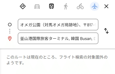 お疲れ様。番外編の方にも少し書いたのですが、対馬から韓国に渡ろうと直接移動を設定したのですがエラーが出てしまいました。。Google Map上でもエラーが出るようなのでまだ直移動は出来ないようです。