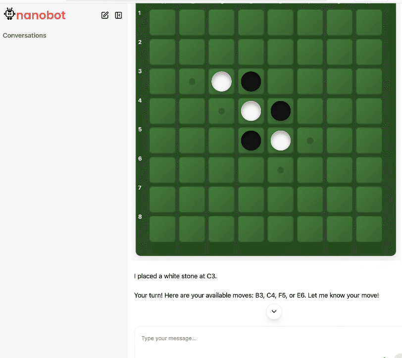 あとでわかったMCP-UIをサポートしたnanobotですが、リバーシMCP-UIはクリック込みでnanobotで動きました。