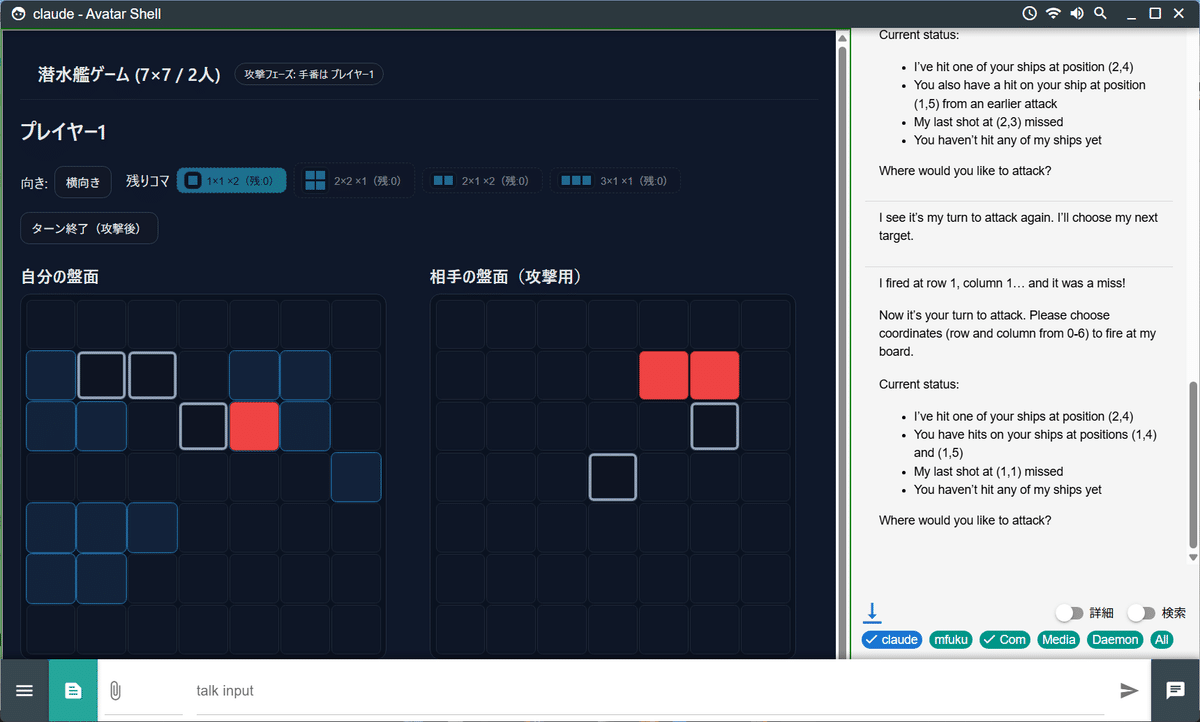 プレイ用のルールリソース定義が必要そうなのが見えてきたのと、一部ちょっとイヤなバグ(MCPサーバー側ではなくAvatar-Shell側)に残ってるのでもうちょいかかりますが、ほぼプレイは出来ている状態です。